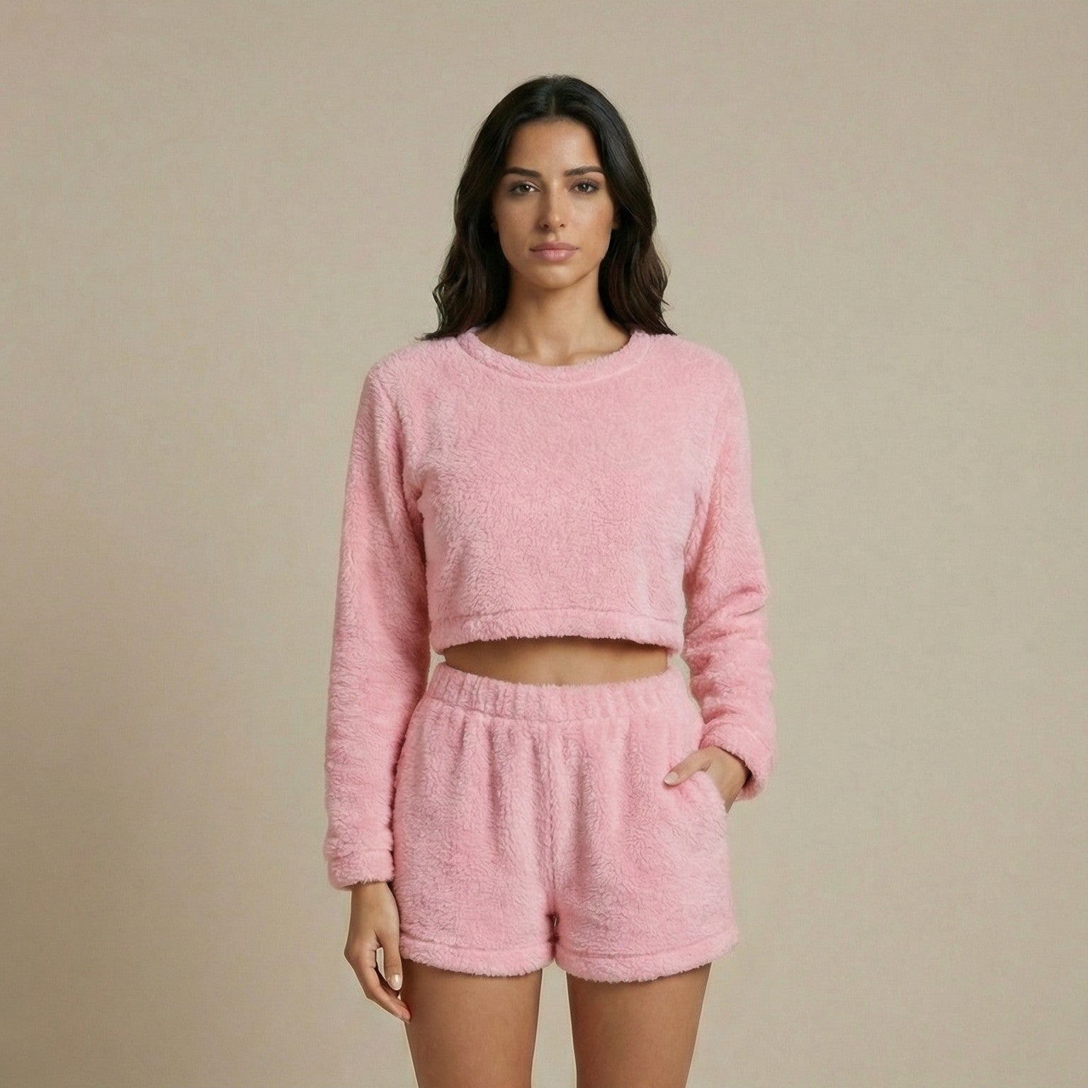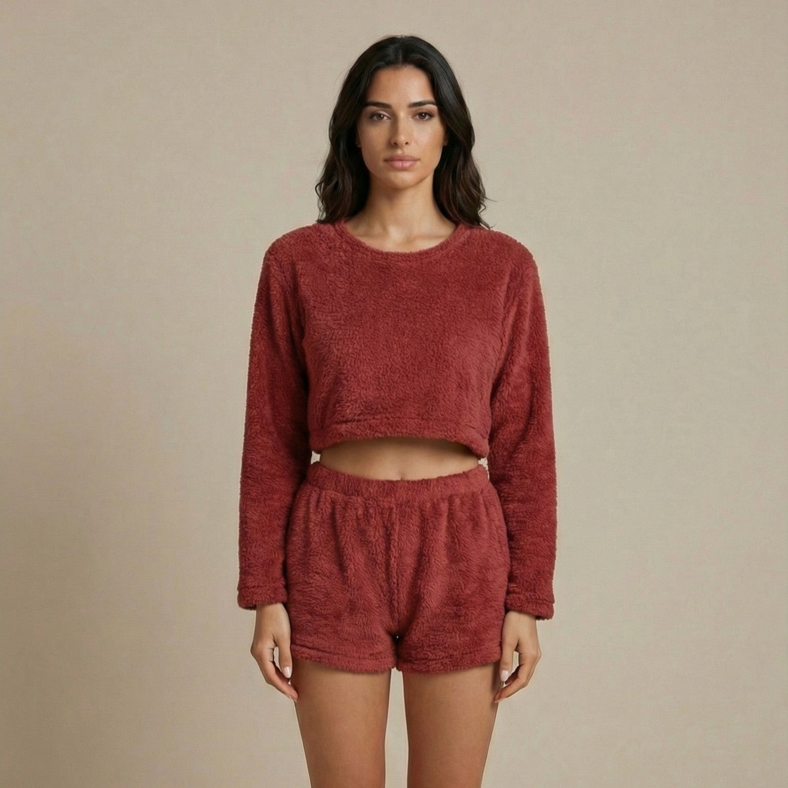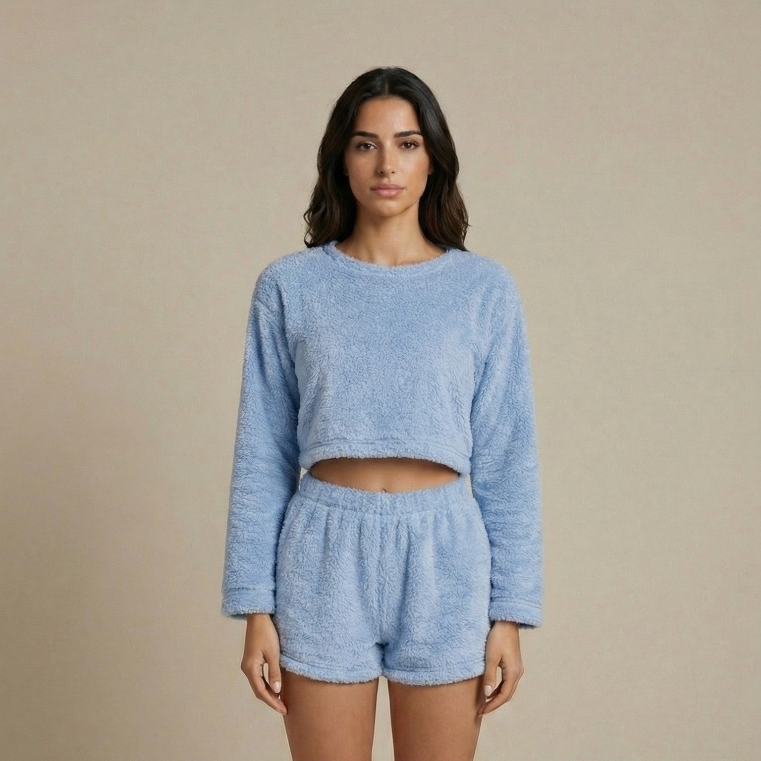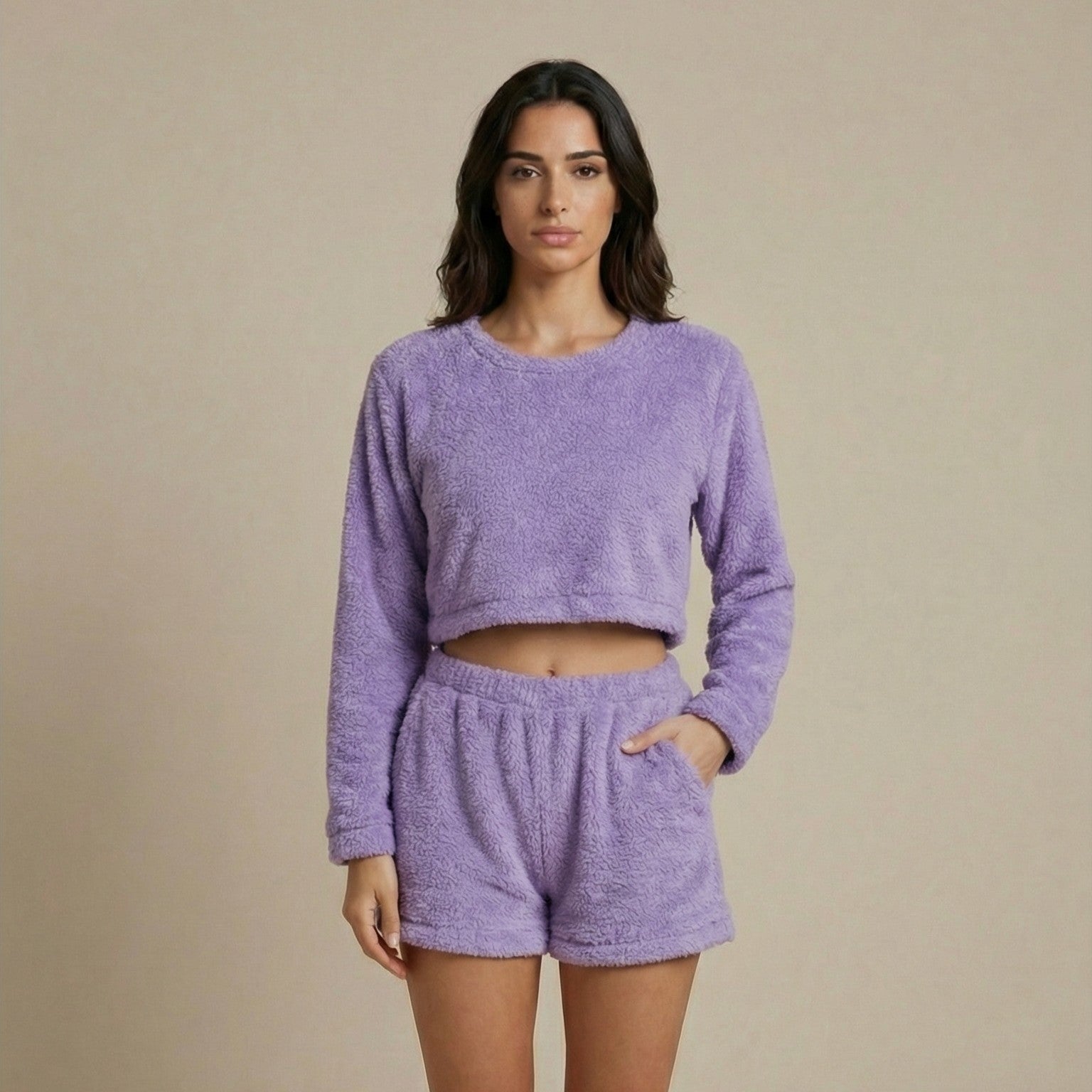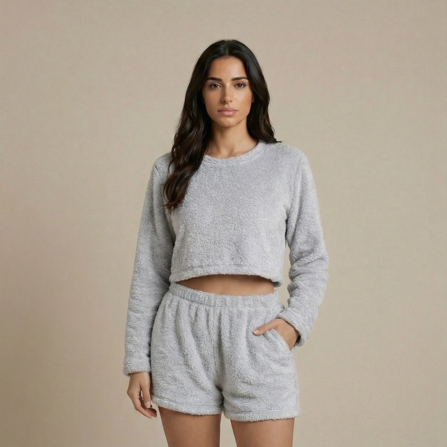 Il tessuto plush fleece trattiene il calore senza far sudare grazie alla sua struttura traspirante, mentre la vestibilità rilassata accompagna i movimenti in modo naturale. Il completo due pezzi unisce praticità e stile minimal moderno, perfetto da indossare dal letto al divano senza mai rinunciare all’eleganza.